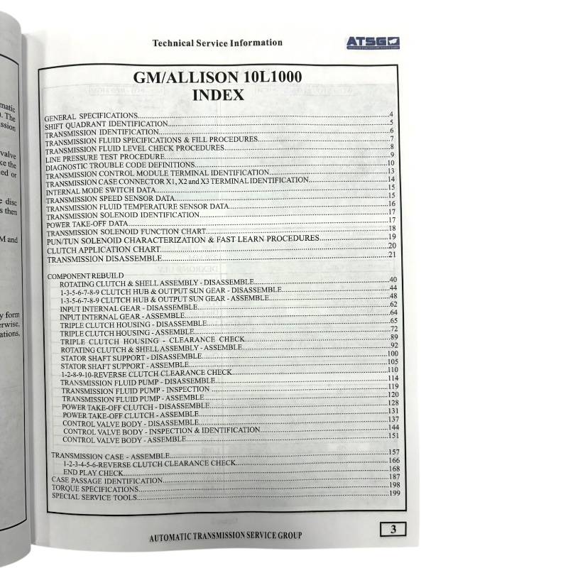 Rebuilding your Allison 10L1000 doesn't have to be a game of guess and check. This service manual from ATSG is an excellent resource for novice builders and DIY'ers. Each book includes an expansive step by step teardown and assembly procedure as well as components tests and identification help. ATSG has a long standing reputation of being THE source for transmission repair literature.